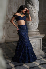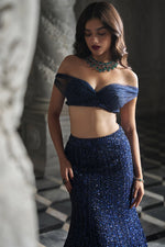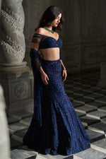 This skirt set features tone on tone embroidery on a navy base. The off shoulder blouse is paired with a matching dupatta.