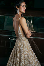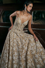 A nude tone gown featuring all over sheer ribbon, pearl, sequin and crystal embroidery on a nude net base in a leafy pattern. The outfit is a corset fit bodice with a plunging back and has a flowy flare.