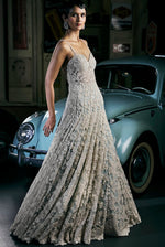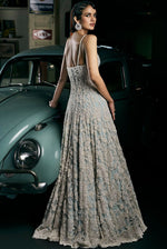 A powder blue gown featuring delicate pearl, sequin, and crystal embroidery in a floral pattern. The corset bodice shows intricate cut work on the neckline as well as at the hem of the flare.