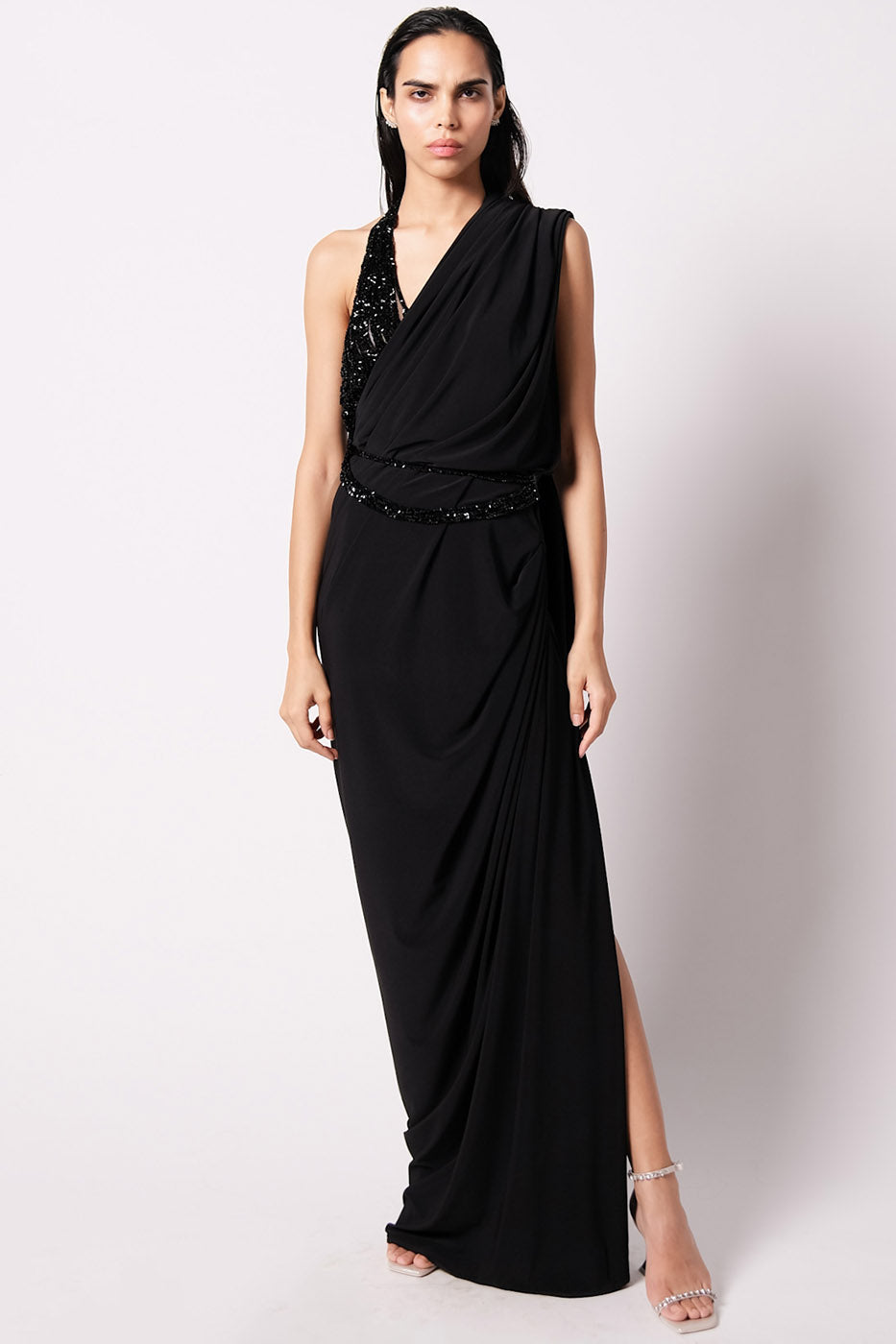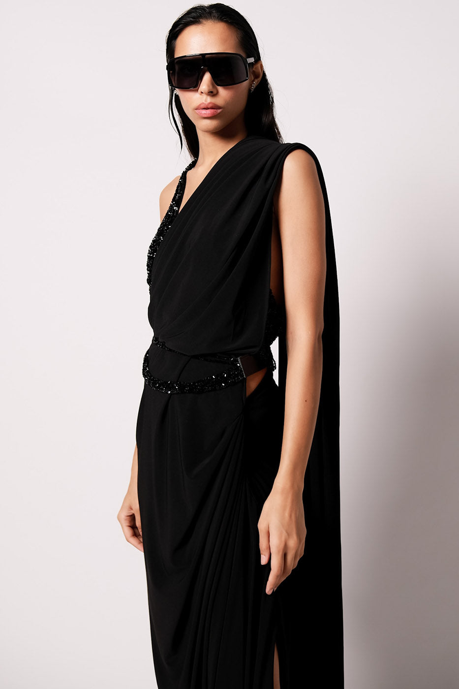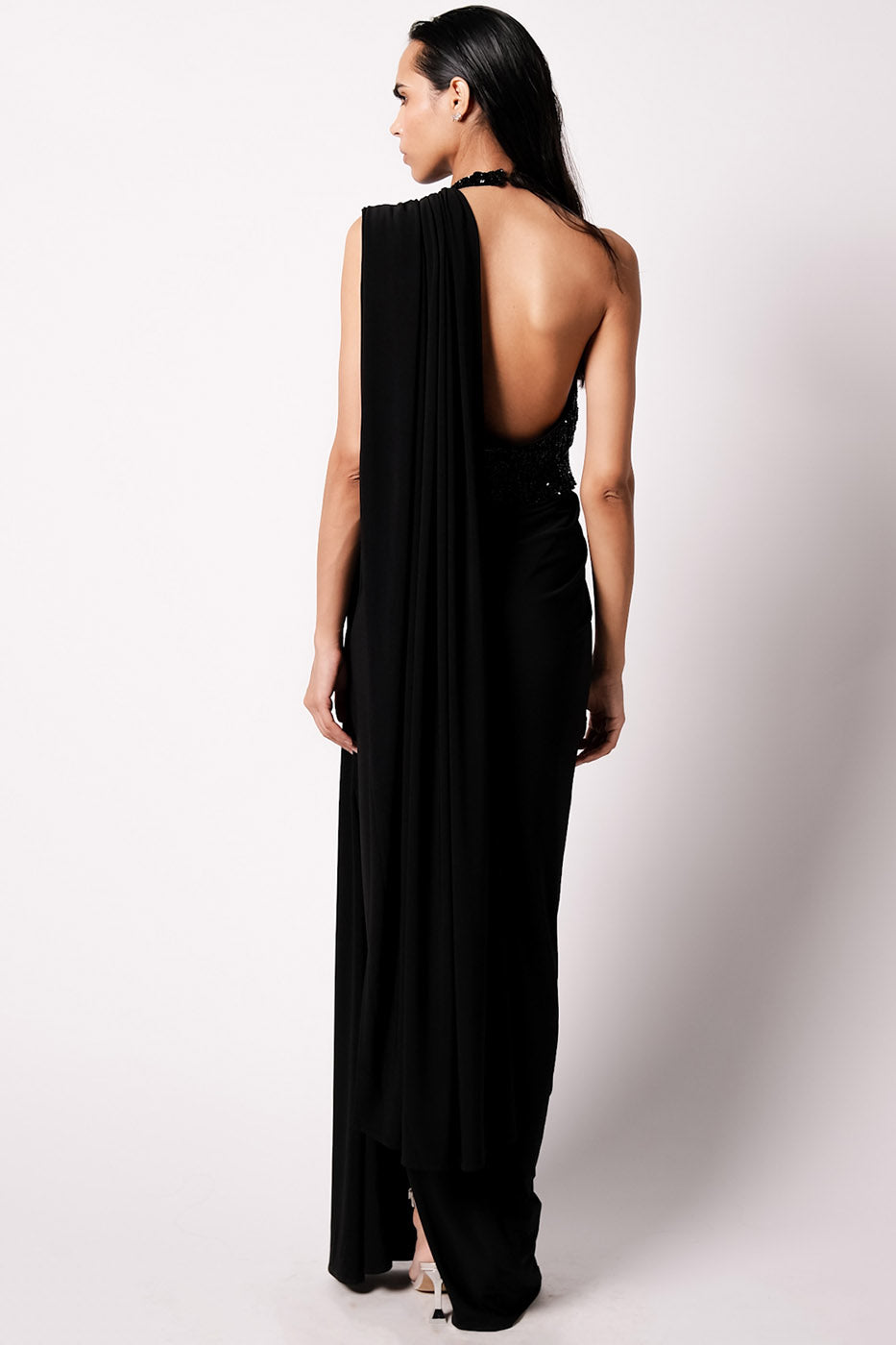 The new drape for the season, The Annie Sari has a side drape detail and looks like a dress from the front. Cut in a luxe jersey, it takes the shape of your body. It comes with an attached petticoat and closes on the side with hooks and snap buttons. Paired with a statement Rain Blouse which is delicately embroidered with glass crystal beads over a span of 15 days. It also comes with an embroidered belt that acts as a great accessory on its own.