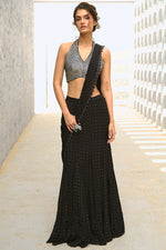 Black pre-stitched gusset saree paired with sequence and glassbeads encrusted halter neck blouse.