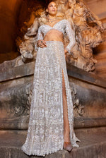 This grey skirt set features embroidery in white and silver sequin and crystal. The skirt has a high slit. The full sleeves blouse comes with a plunging neckline and tassels at the wrist. It is paired with four sided embroidered net dupatta.