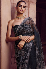 Featuring motifs of nature on a contemporary drape, Sayori is perfect for starlit soirees. Crafted in light-as-air tulle, it is elevated in beads & sequins to mirror the gleam of celebrations.