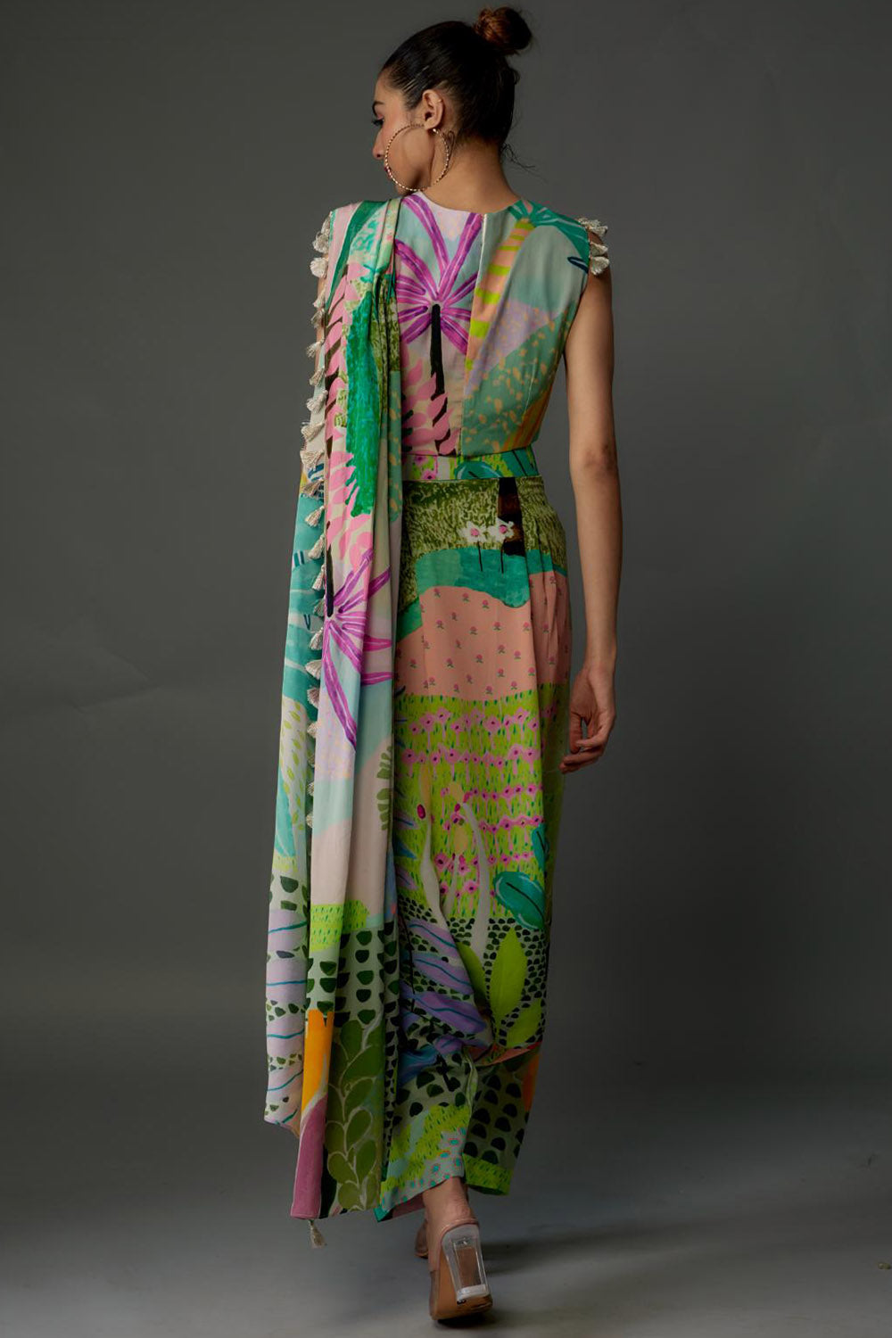 Tropical print crepe top and low-crotch pants with attached drape.